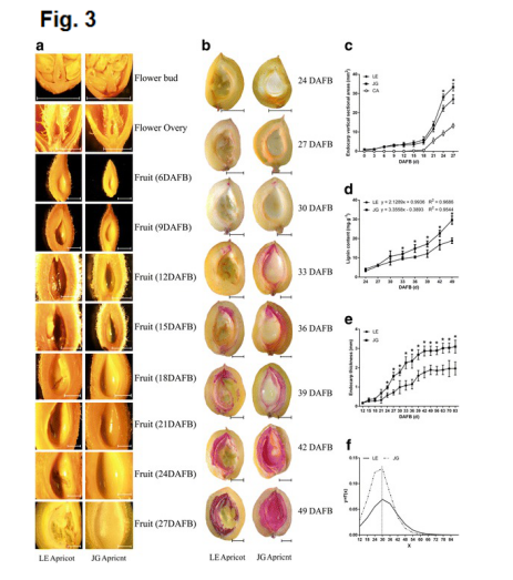 a)如圖2所示,兩種品種杏的果實具有相似的發(fā)育模式,a1、b1、c1是以開花后時間(DAFB)為橫坐標(biāo),分別以果實重量、果實長度、果實寬度為縱坐標(biāo)做圖,兩種杏的果實均呈現(xiàn)出了“雙S曲線”生長模式,圖a2、b2、c2是分別對a1、b1、c1一階導(dǎo)數(shù)作圖,兩種果實同樣也表現(xiàn)出相似的趨勢。 根據(jù)生長曲線,研究者將果實的發(fā)育劃分為4個時期:第一次指數(shù)生長期(before 30DAFB)、緩慢生長期(30-49DAFB)、第二次指數(shù)生長期(49-83DAFB)、成熟期(after 83DAFB)。