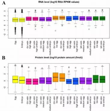 為了探索mRNAs甲基化是否與翻譯有關(guān),作者把mRNA甲基化數(shù)據(jù)與Smits等人已發(fā)表的轉(zhuǎn)錄組和蛋白組數(shù)據(jù)進(jìn)行了整合。通過(guò)BLAST分析,在RNA/蛋白數(shù)據(jù)中找到了723個(gè)m6A修飾mRNAs的信息。GV期或者M(jìn)II期卵母細(xì)胞中高m6A峰的RNA水平(log10 RNA RPKM值)比總RNA高(在卵或者胚胎中),但是蛋白水平(log10 protein amount / fmol)比總蛋白水平低(Figure 2)。與高度甲基化的mRNAs相比,低甲基化RNAs顯示出非常高的表達(dá)水平(Figure 3)。這些結(jié)果說(shuō)明在卵母細(xì)胞或早期胚胎中,m6A修飾可能與mRNA翻譯有關(guān)。