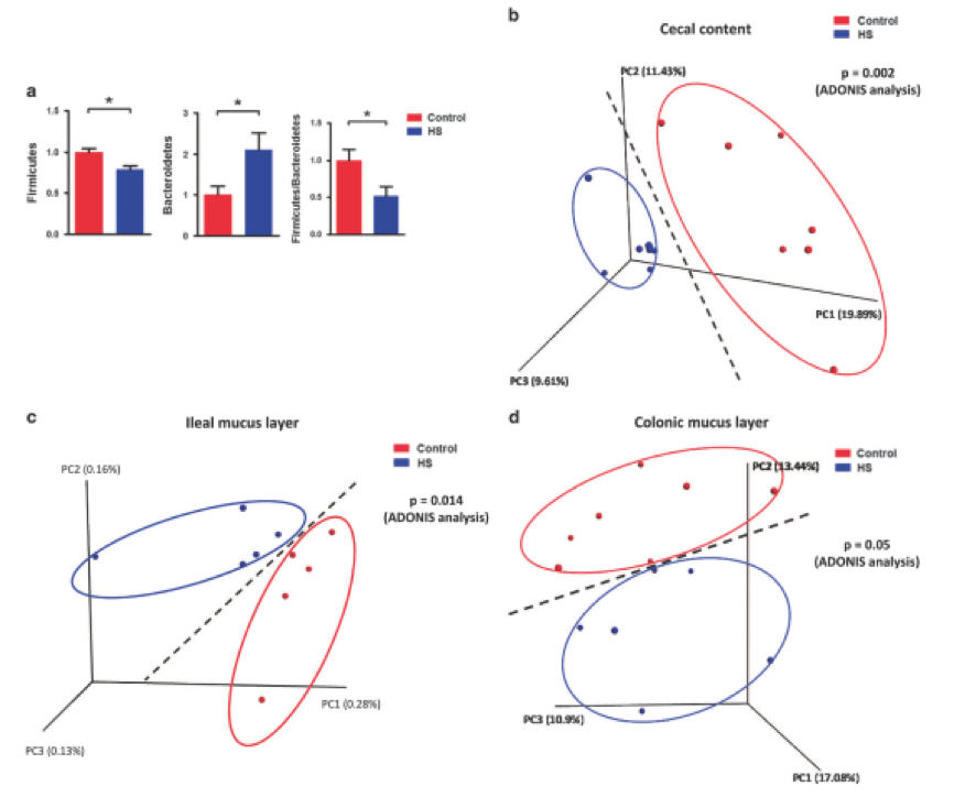 為了研究HS攝入如何影響腸道微環(huán)境,研究人員將HS組的細菌組成與對照組相比,在HS處理后,盲腸中Actinobacteria,F(xiàn)irmicutes和Bacteroidetes在門水平和Actinobacteria以及Clostridia和Bacteroidia的百分比顯著不同。unweighted uniFrac分析結(jié)果顯示HS和對照組分別聚集(圖2b)。進一步分析顯示,HS和對照組在回腸粘液層分別聚集(圖2c),而對照組和HS組形成兩個聚類,分離趨勢明顯在結(jié)腸粘液層(圖2d)。研究結(jié)果表明,慢性HS喂養(yǎng)可能導(dǎo)致腸道生態(tài)失調(diào),細菌計數(shù)和微環(huán)境組成的變化也證明了這一點。