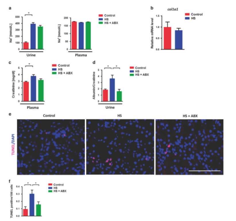 為了進一步闡明HS攝入后腸道生態(tài)失調(diào)和腎損傷之間的關(guān)系,給小鼠喂養(yǎng)多粘菌素B和新霉素。抗生素給藥確實恢復(fù)了HS飼喂誘導(dǎo)的回腸Ifn-γ過表達,通過糞便白蛋白和FD-4滲透監(jiān)測腸道泄漏,以及通過血漿內(nèi)毒素水平和腎臟16s / 18s比率監(jiān)測的細菌移位,通過尿和血漿Na +濃度測量,抗生素不改變鈉負荷(圖5a)。雖然8周HS喂養(yǎng)并未引起纖維化等進展性腎損傷,但由col1a1 mRNA水平監(jiān)測(圖5b),HS喂養(yǎng)增加了血漿肌酐水平。更重要的是,與對照組小鼠相比,HS-喂養(yǎng)小鼠腎功能障礙的主要標志物尿白蛋白/肌酐比率顯著增加,抗生素治療幾乎可以完全恢復(fù)腎功能(圖5d)。另外,TUNEL染色顯示抗生素施用可以降低HS誘導(dǎo)的凋亡細胞的升高(圖5e和f)??傊?,該數(shù)據(jù)表明,抗生素治療能夠改善腸道滲漏和HS喂養(yǎng)引起的早期腎損傷。