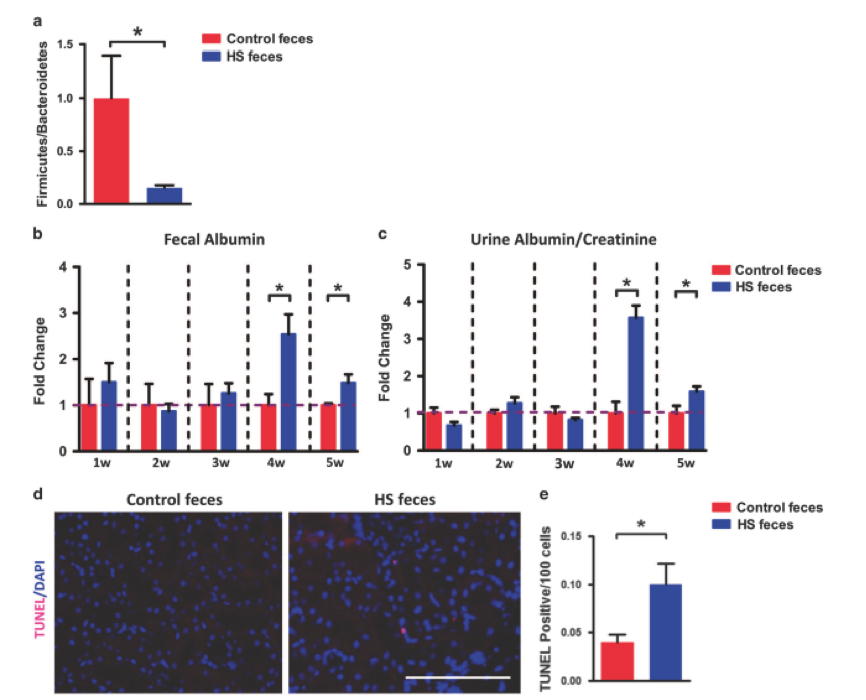 最后,為了進一步證明腸道微生物群是腎損傷發(fā)展的上游因素,進行了糞便微生物群移植實驗。喂食正常飲食(不是高鹽)的兩組小鼠口服來自對照和HS處理的小鼠的糞便。8周后,接受對照糞便的對照小鼠的盲腸壁Firmicutes/Bacteroidetes比例(其是微生物群組成改變的主要標志)顯著高于接受HS糞便的HS小鼠,其為 與研究人員之前的數(shù)據(jù)一致,表明HS喂養(yǎng)降低了盲腸中的Firmicutes / Bacteroidetes比例,并證明該糞便微生物群移植實驗是成功的(圖7a)。此外,如圖7b和c所示,給藥后4周,由糞便白蛋白含量監(jiān)測的腸道通透性在接受HS喂養(yǎng)糞便的小鼠中顯著增加,并且重要的是,尿白蛋白/肌酸酐比率(目前研究中觀察到的腎功能障礙的主要表型)在移植后4周接受HS喂養(yǎng)的糞便的小鼠中也顯著增加。最后,與對照小鼠相比,HS糞便移植小鼠中腎臟凋亡細胞的數(shù)量顯著增加(圖7d和e)。這些數(shù)據(jù)進一步表明,HS喂養(yǎng)引起的腸道生態(tài)失調(diào)是腎損傷和功能障礙的原始誘因。